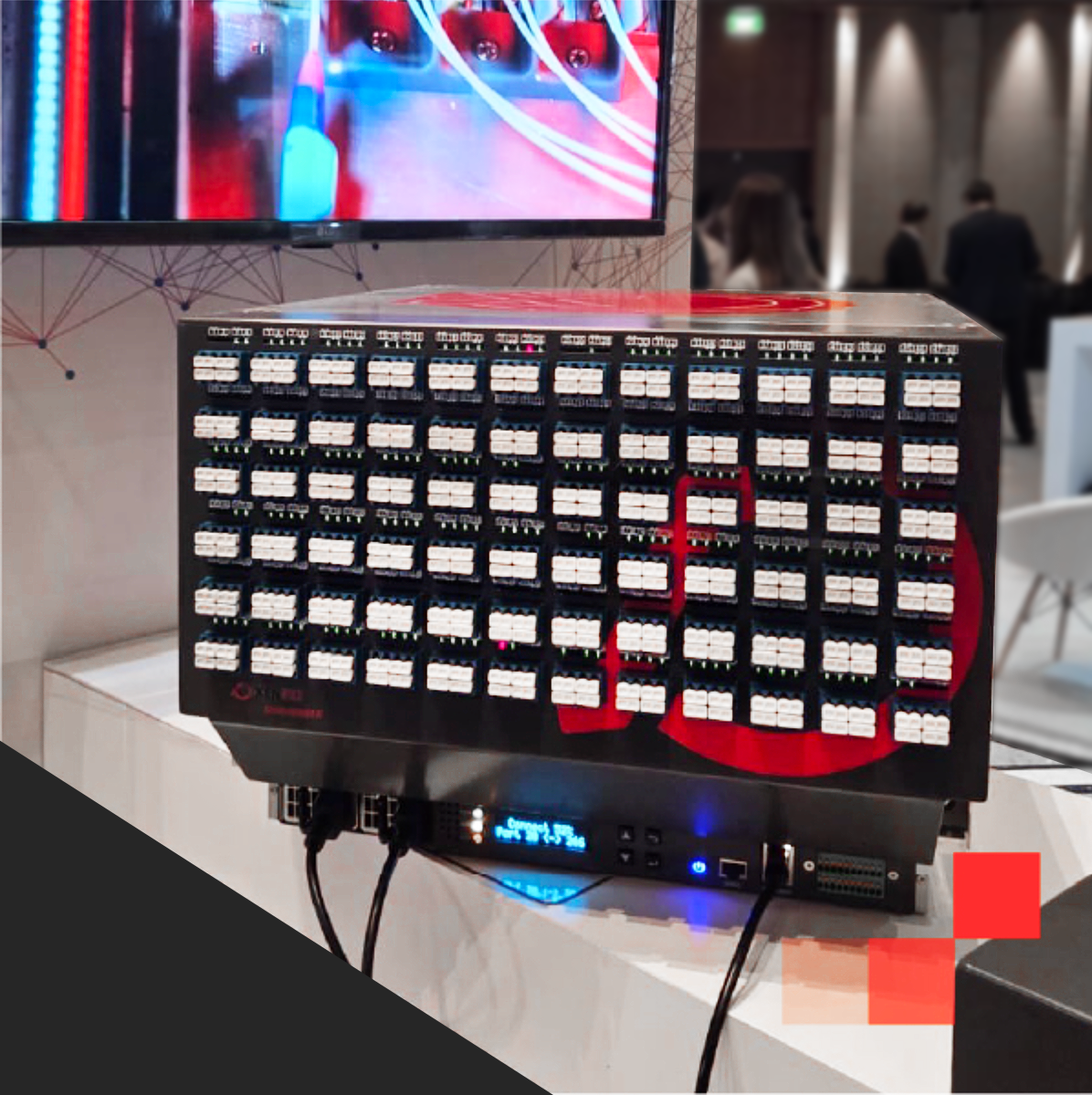 A motorized optical cross-connect installed at the rack top. It replaces manual patching so teams can switch fiber paths remotely with consistent optical performance and full auditability.